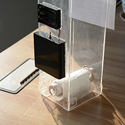 该作品是一个智能洗手间,旨在实现在上公共厕所时,无需开门能直接判断出该厕所位是非有纸。